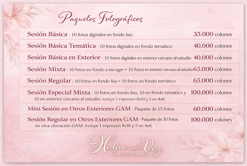 *Estos paquetes son para un máximo de 5 personas. persona adicional paga 5000 colones y se lleva una foto extra. Mascotas pagan un adicional de 3000 colones y tambien se llevan una foto extra.
